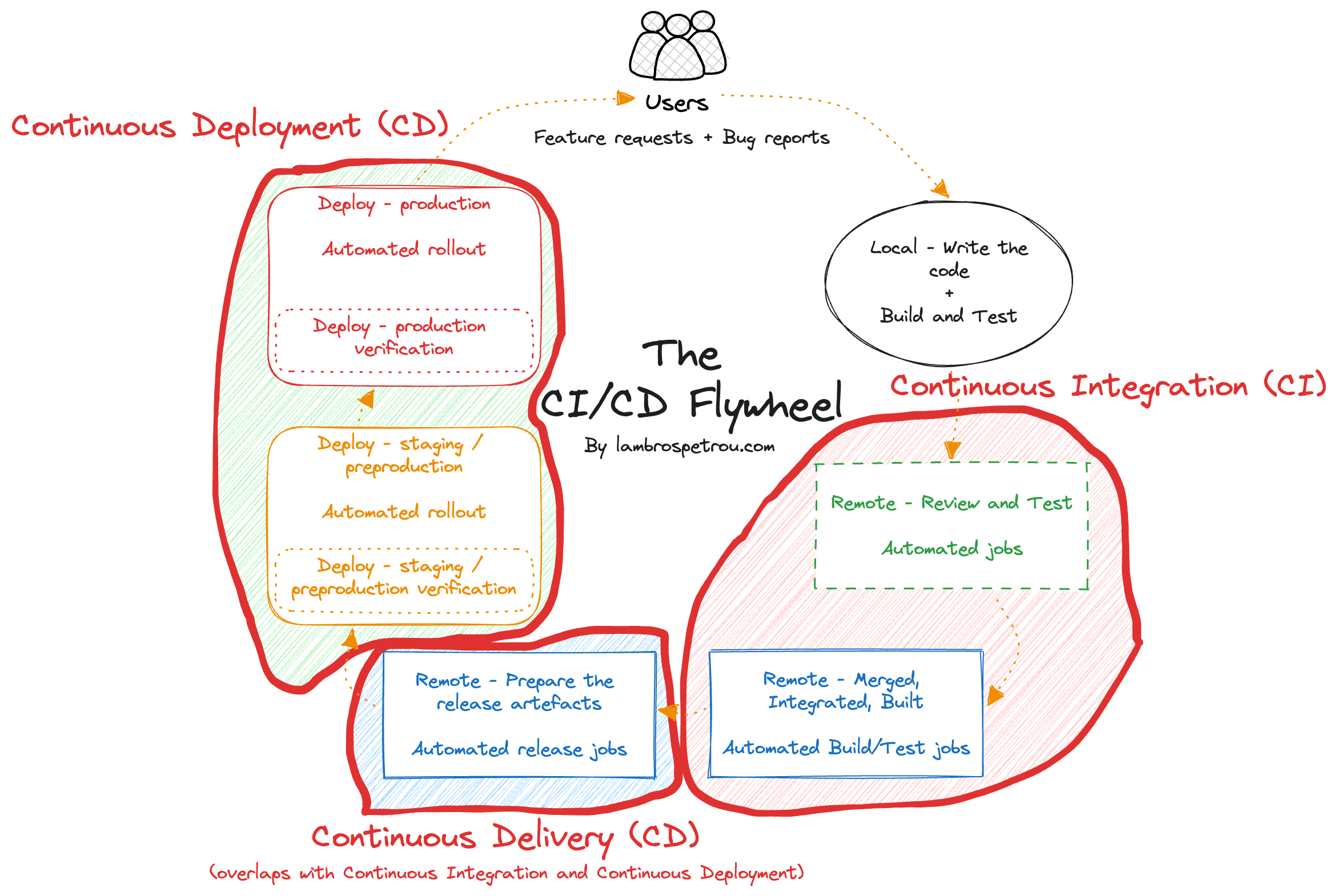 In the diagram below we can see how the steps of the flywheel map to the CI/CD phases: Continuous Integration (CI), Continuous Delivery (CD), and Continuous Deployment (CD).