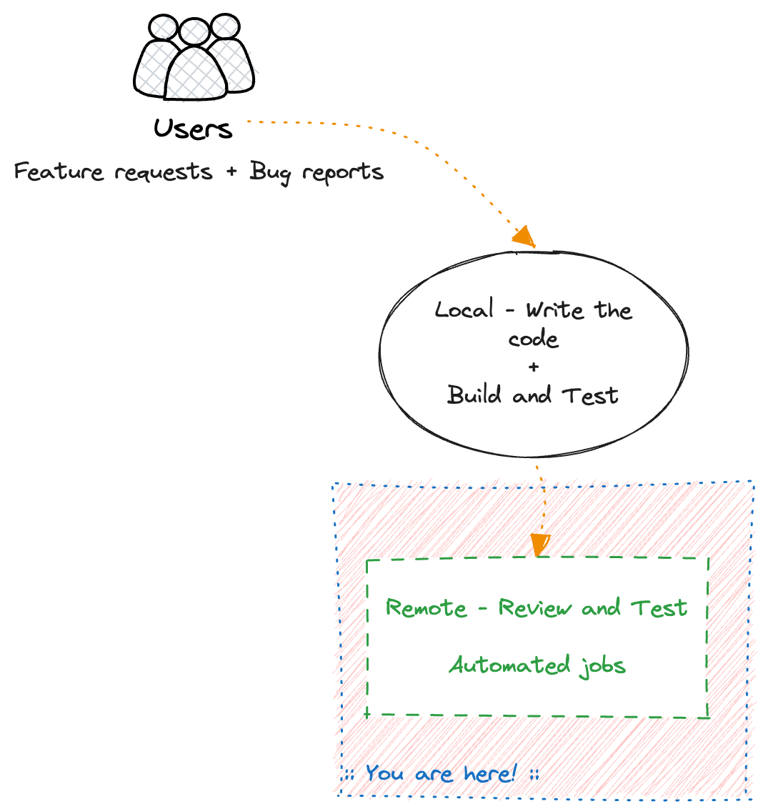 The full flow is what I call The CI/CD flywheel, and as we will see at the end, all the steps of the flywheel are what a CI/CD pipeline implements.