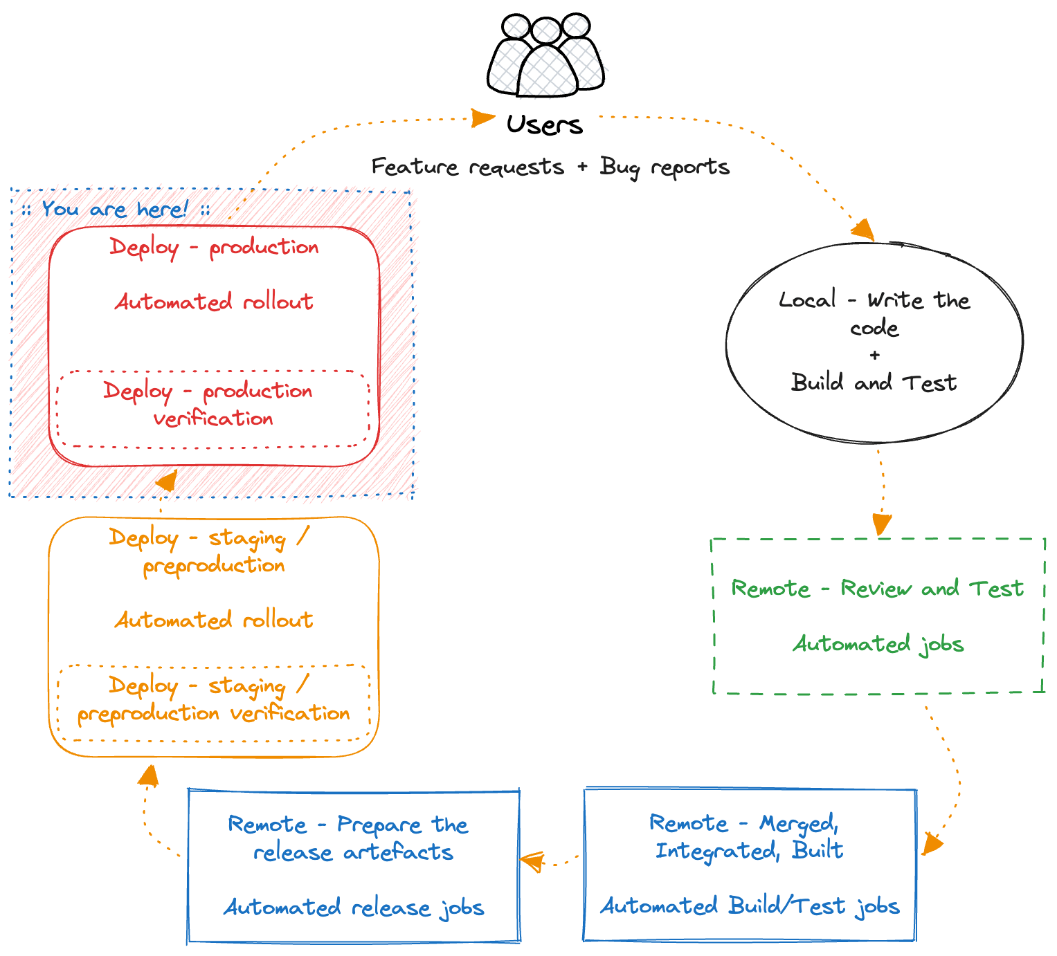 One way to cycle through the flywheel faster, is to remove certain steps, for example the verification steps, or even the whole preproduction environment. Indeed, this will shorten the circle. However, there is a hidden trap in this thinking.