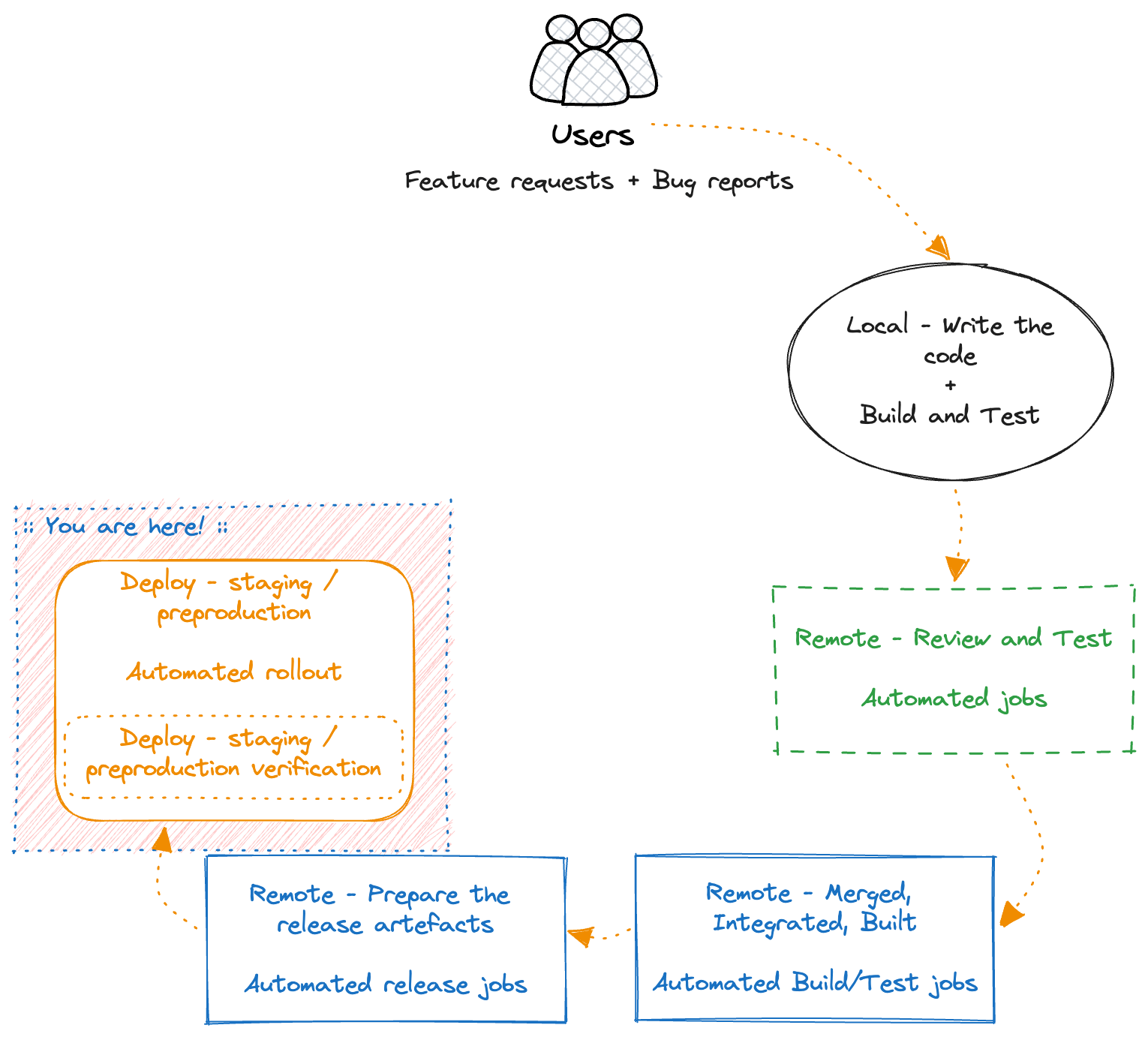 - After a few hours, or days, the QAs approve, and we now ship the change to production.
