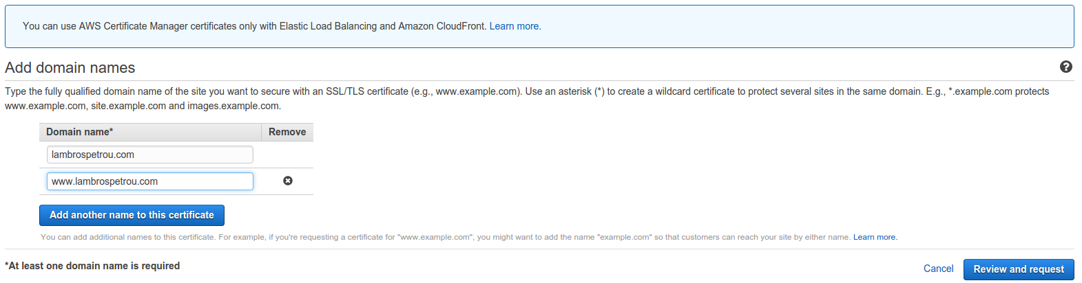 - If you have already uploaded your own custom certificate to AWS use that, otherwise click Request an ACM certificate to get an Amazon certificate for free.